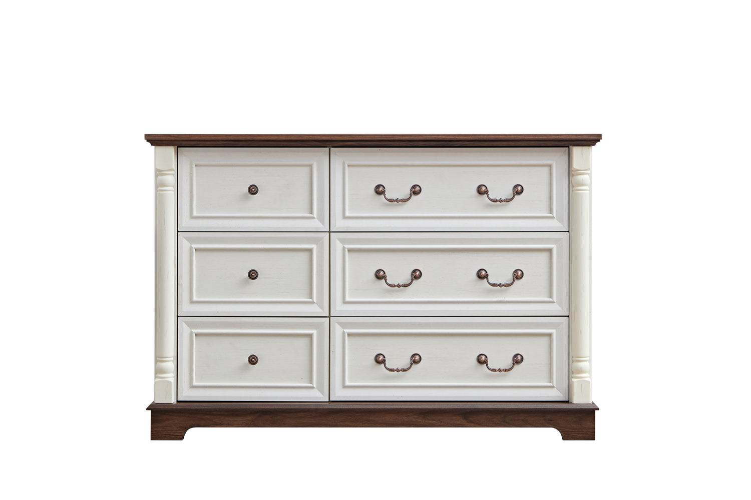 - Bring warmth to your bedroom/living room with this 6-drawer dresser featuring an antique two-tone finish texture that stands out against the dimpled finish. Wooden base and solid wood columns adorn the piece for a beautiful look. Pair with unique antique tone pulls for years of satisfaction. Pair with the entire bedroom furniture collection