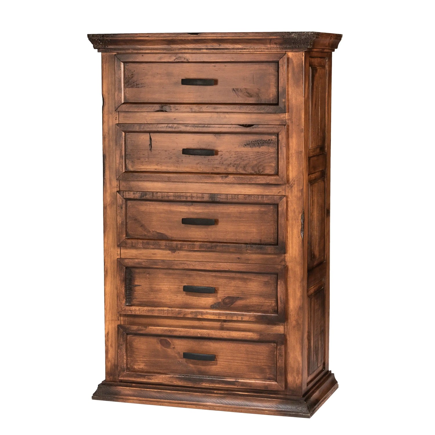 Each drawer is equipped with extension metal slides, ensuring smooth and effortless operation while providing convenient access to your belongings. Metal pulls add an industrial touch to the rustic aesthetic, enhancing the dresser's overall design.