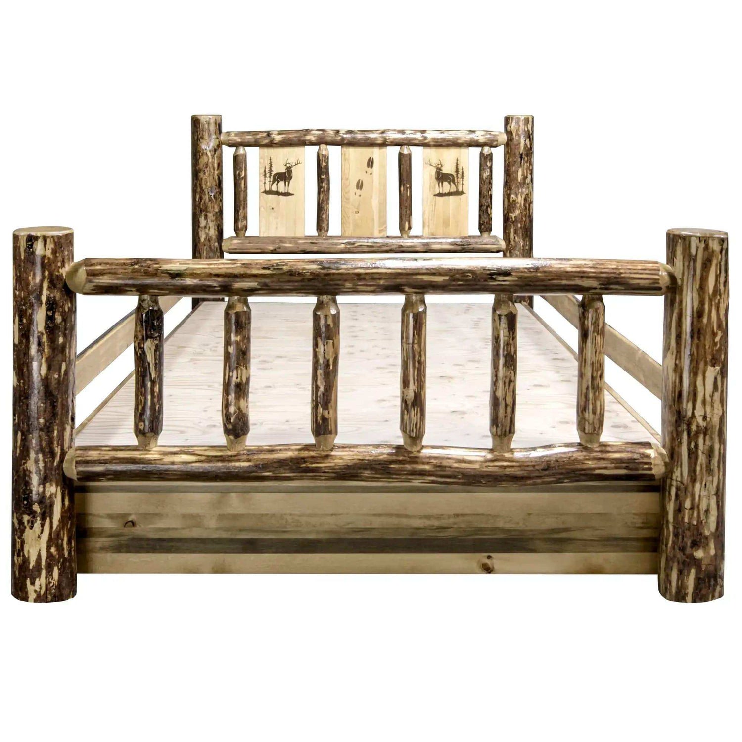 This unique spindle style log bed with storage features a rustic themed, laser engraved three panel headboard with a unique bear/elk motif. Six full sized, 21" wide, 16" deep, 5.5" high dresser drawers mounted on full extension, ball bearing glides ensure years of quiet, trouble free use. Combining the storage capacity of a 6 drawer dresser with the durability and attractiveness of a mortise and tenon style bed is a sure way to add rustic elegance and extra storage capacity to your bedroom. The Glacier Country Collection features a truly unique finish reminiscent of the Grand Lodges of the Rockies, circa 1900. Craftsmen remove the outer bark using old-fashioned draw knives while leaving the inner cambium layer intact for increased texture and contrast. The process is completed in a professional eight step process that applies stain and lacquer for a durable, low maintenance finish. Dark, rich hues and tones provide an extraordinary appearance! Some assembly required. Instructions and hardware included. 550 pound capacity. A 20-Year limited warranty included at no additional charge. Handcrafted in Montana, U.S.A. using genuine lodge pole pine!