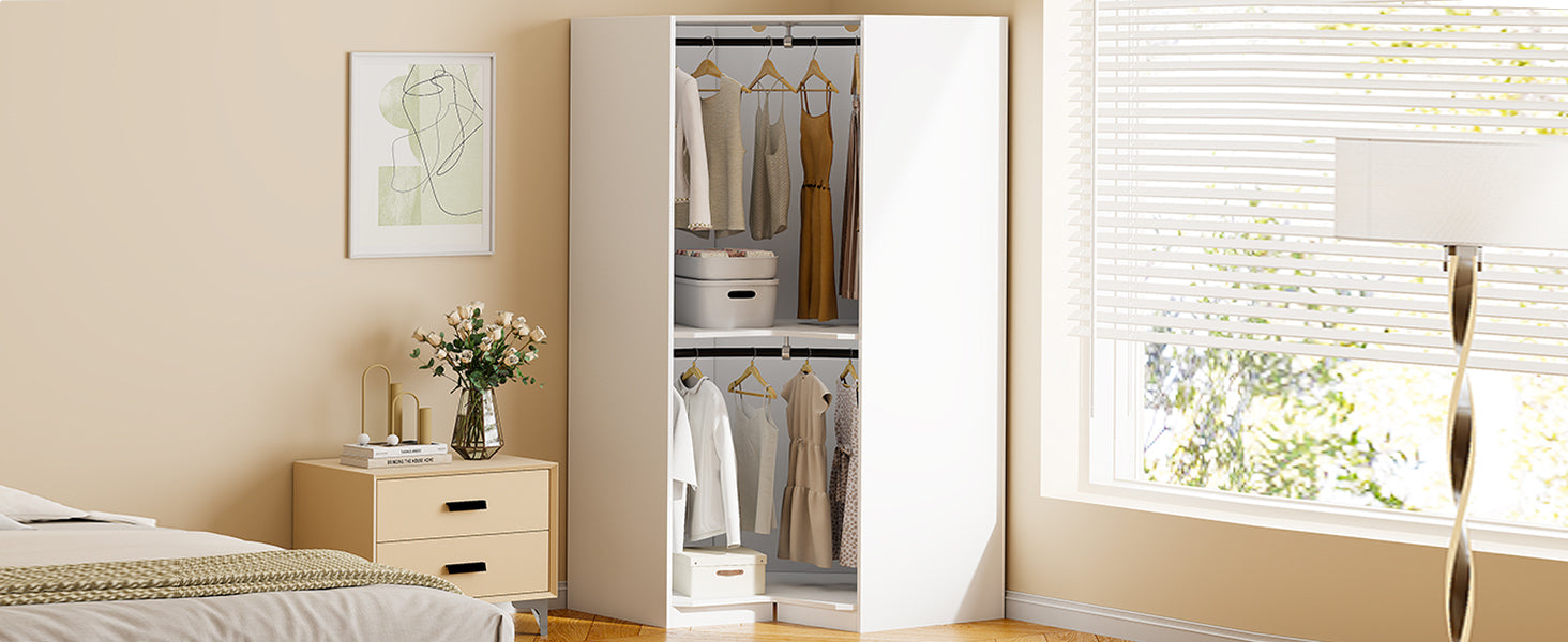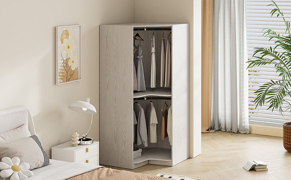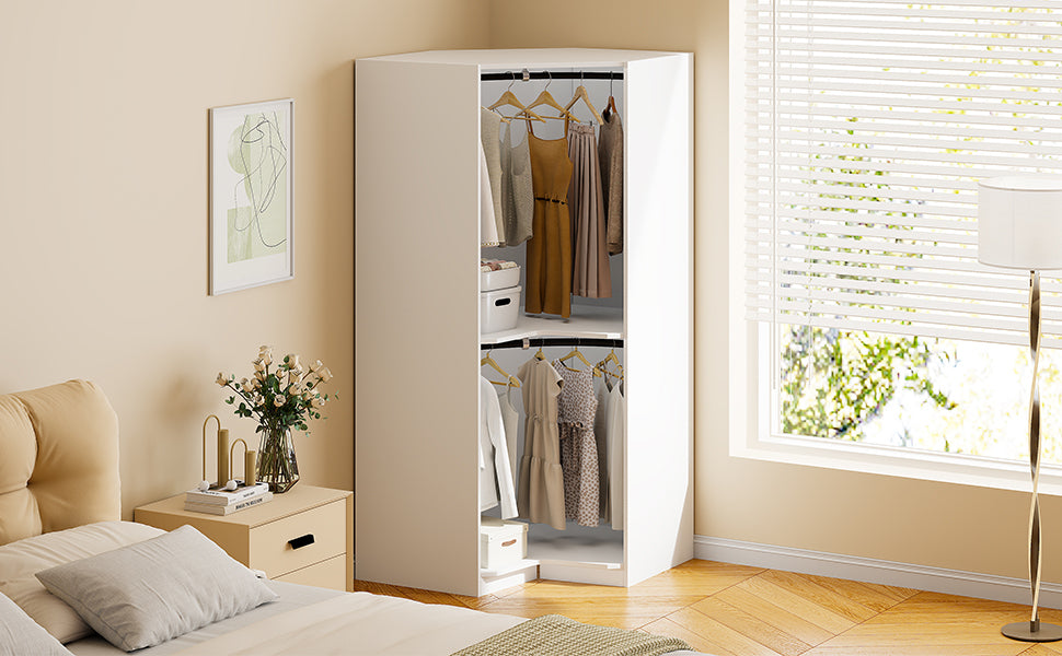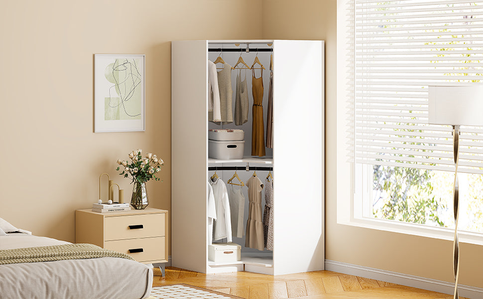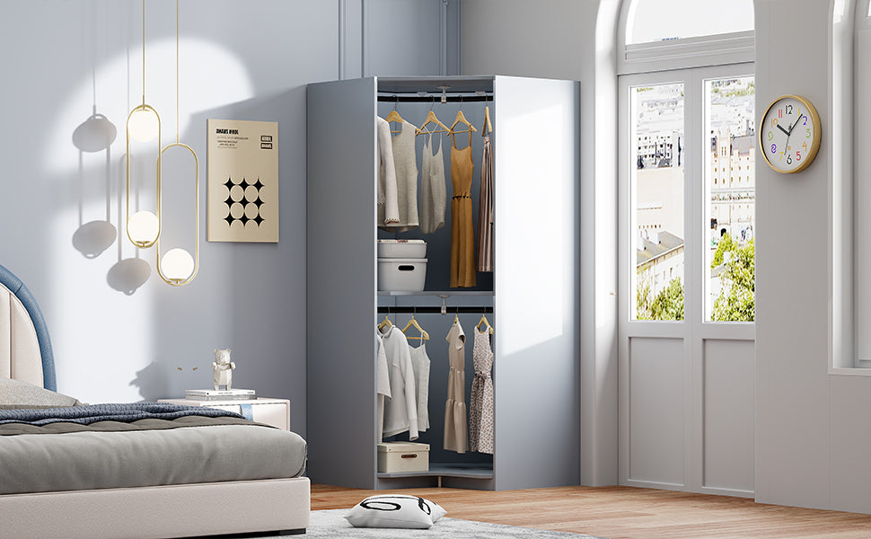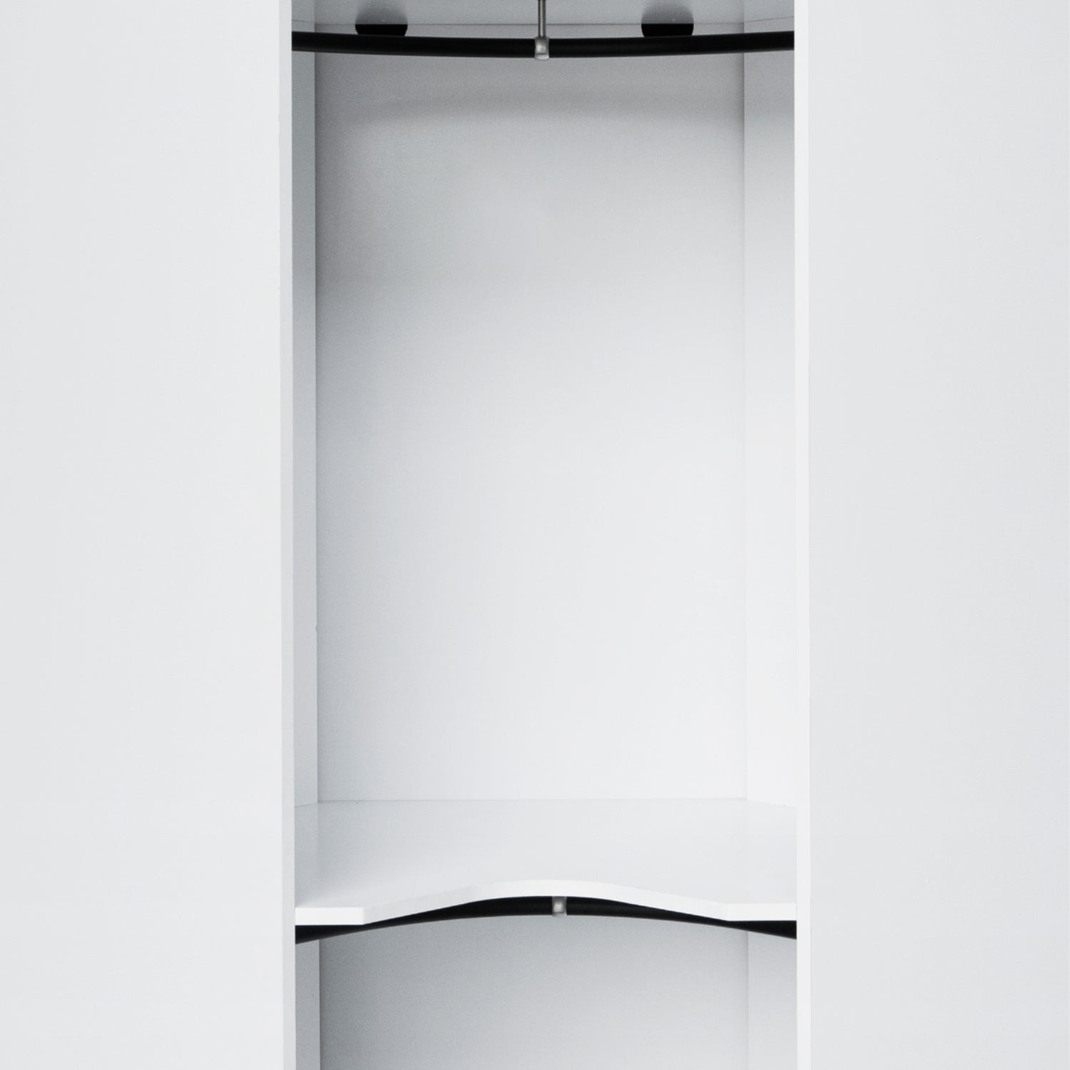 - Dual Shelving Units. Featuring two practical shelves, the wardrobe provides generous storage space for clothes, shoes, and accessories, keeping your living space organized and clutter-free. Designed with a dedicated hanging area, perfect for storing garments neatly and conveniently, offering easy access to your wardrobe essentials.