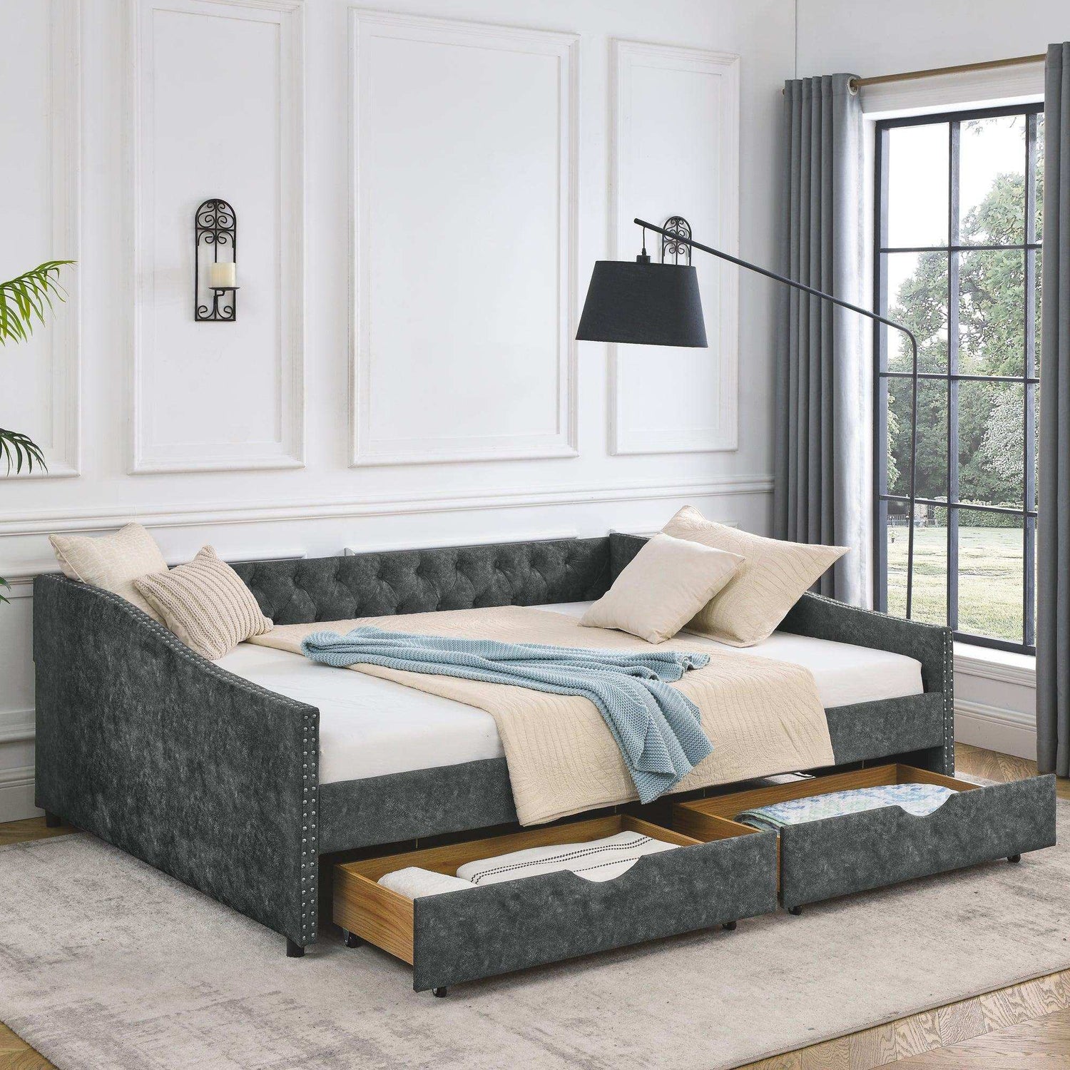 - Looks Stunning. This mid-century inspired queen daybed features a button tufted back which creates an elegant look. The waved shape arms decorated with nailhead trimming blends chic details with classic style. This daybed lends a sophisticated air to your home.