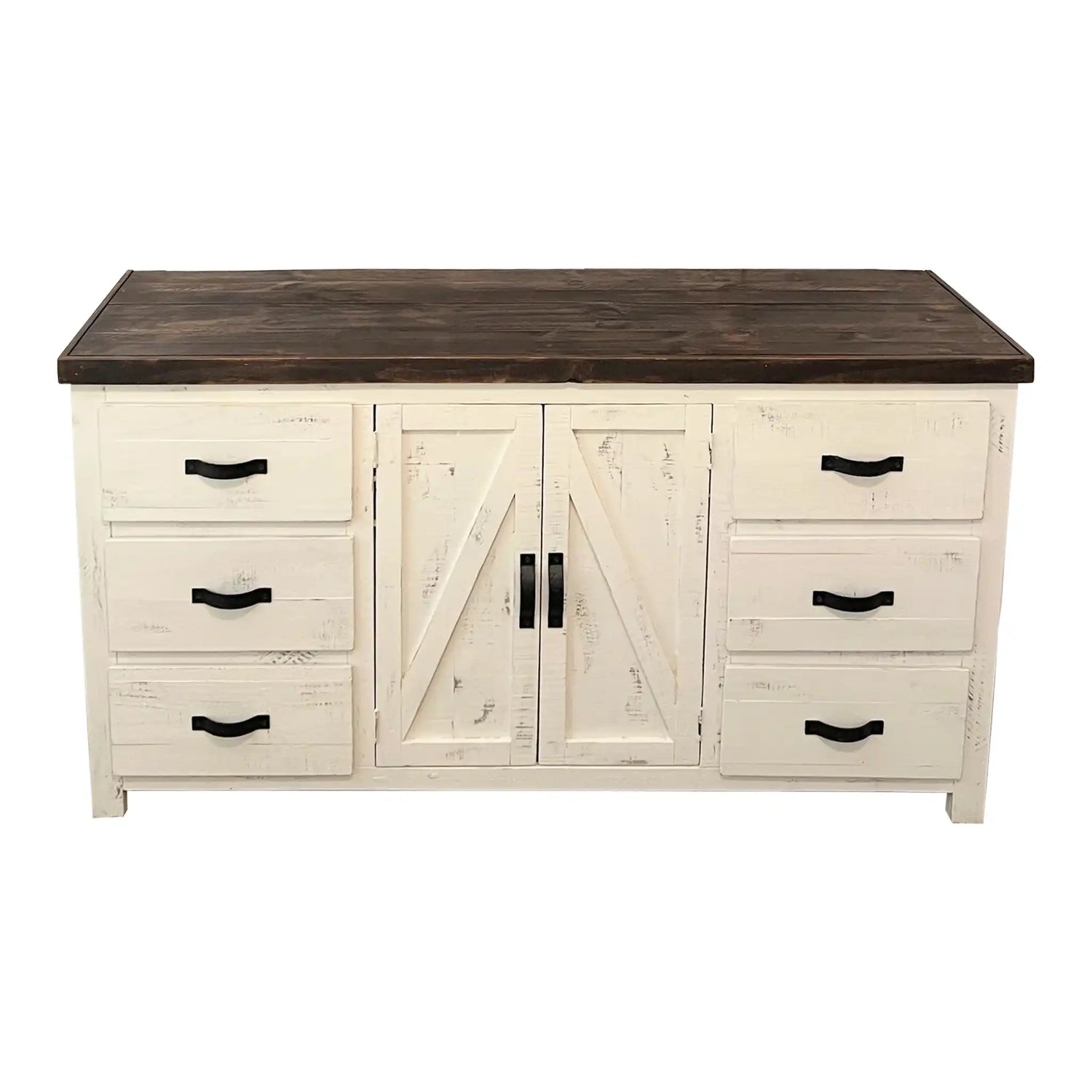 Transform your space with the Rancho Dresser from Rustics For Less, crafted to complement rustic decor with its Nevada-inspired charm. Featuring a practical design with three drawers on each side and two centrally located doors with a shelf inside, this dresser offers ample storage and rustic appeal. Finished in a Nevada-inspired style, it pairs beautifully with the Rancho Bed, creating a cohesive bedroom ensemble that exudes warmth and functionality.