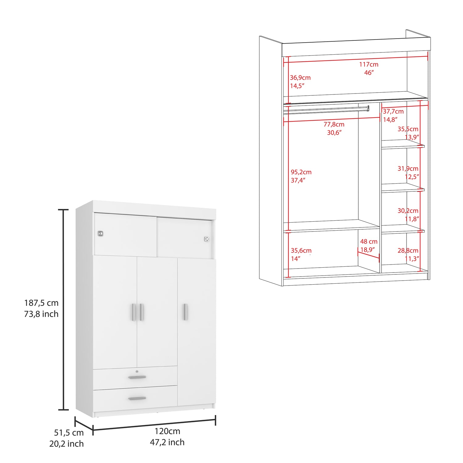 Triple Wardrobe, Hanging Rod, Two Drawers, Two Adjustable Shelves - White