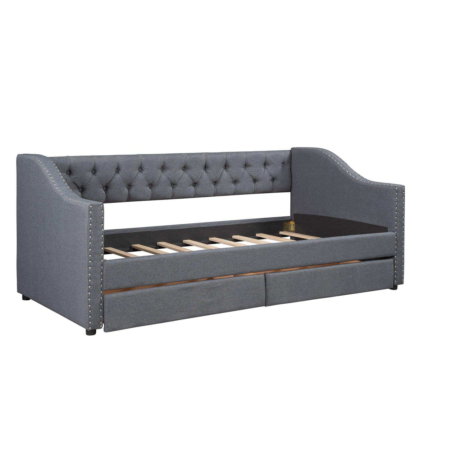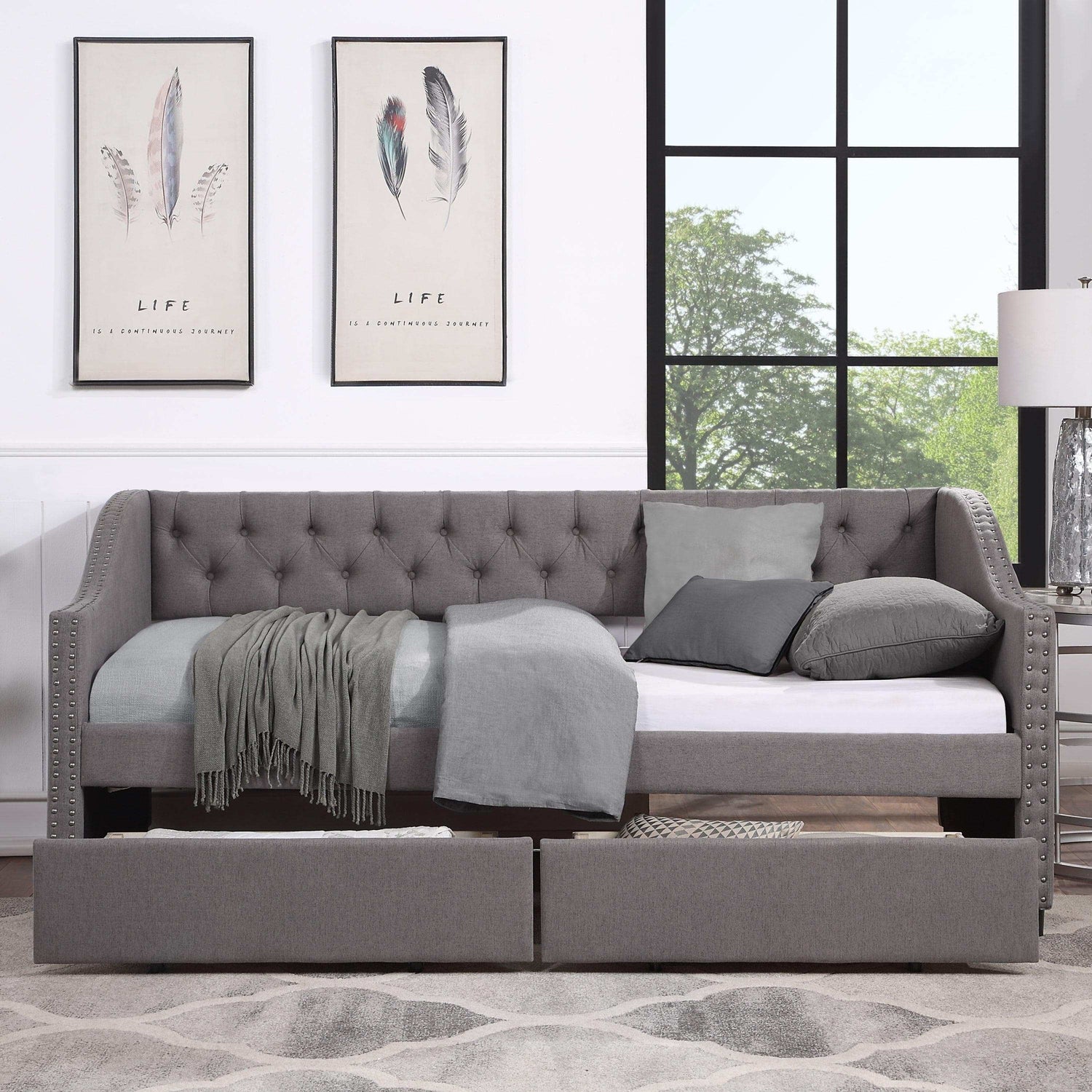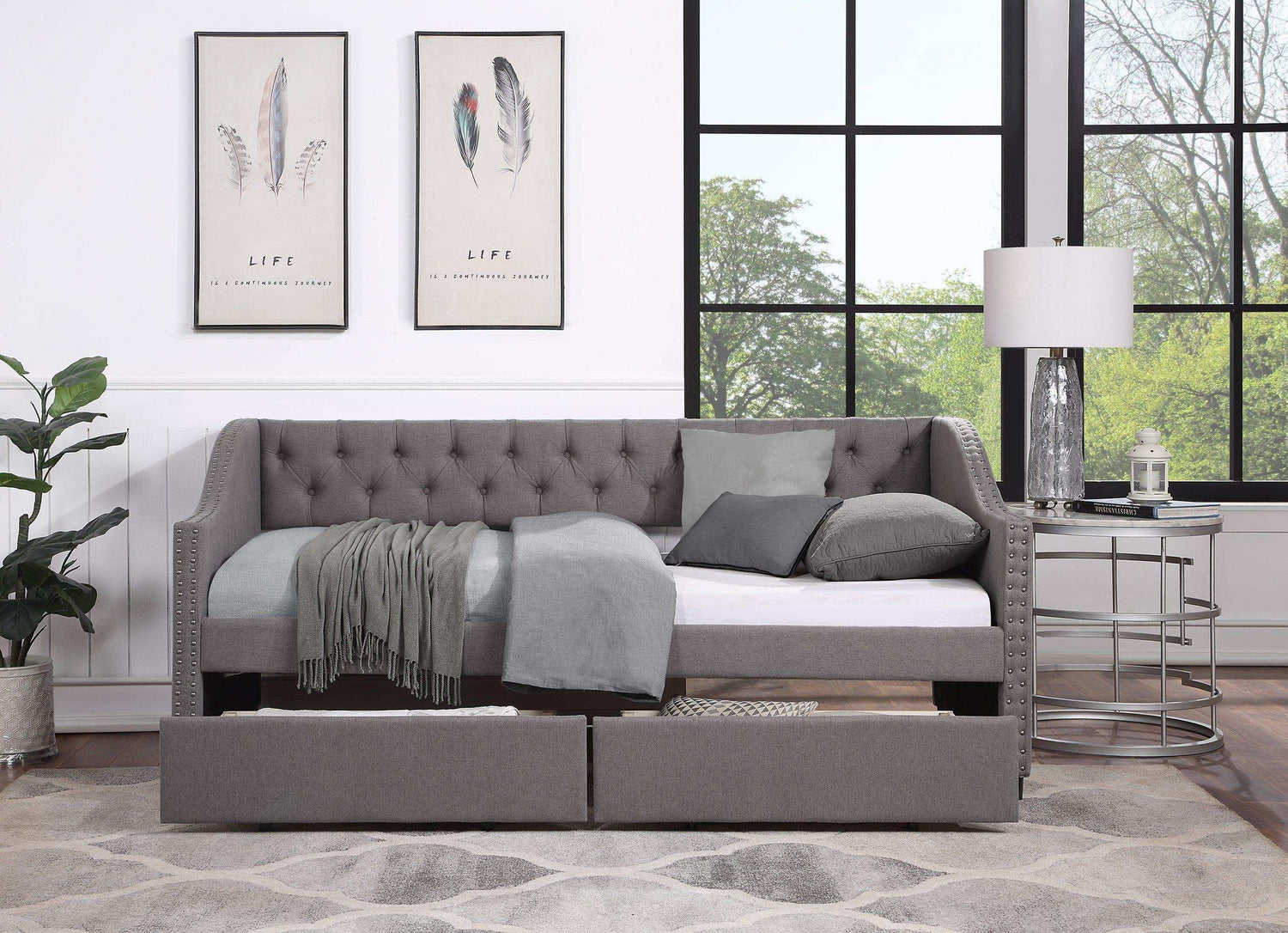 - Elegant design.Β Elegant style Upholstered in carefully-selected linen fabric, in elegant gray, feature a diamond-tufted backrest and two armrests with rivets, this daybed not only suits any home dΓ©cor, but is timeless in its design. The soft textile bedhead creates coziness, while the single color of the design creates versatility.