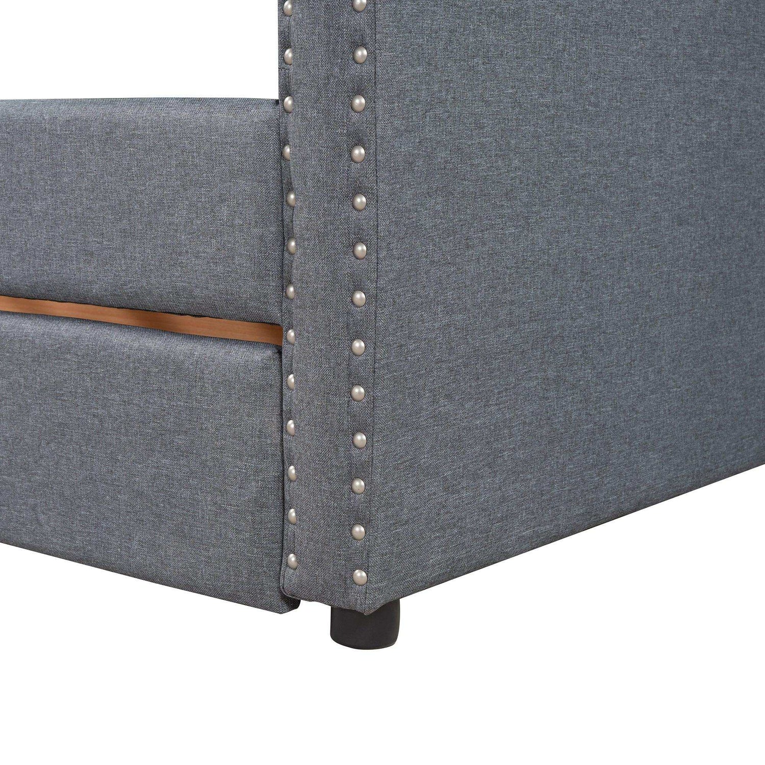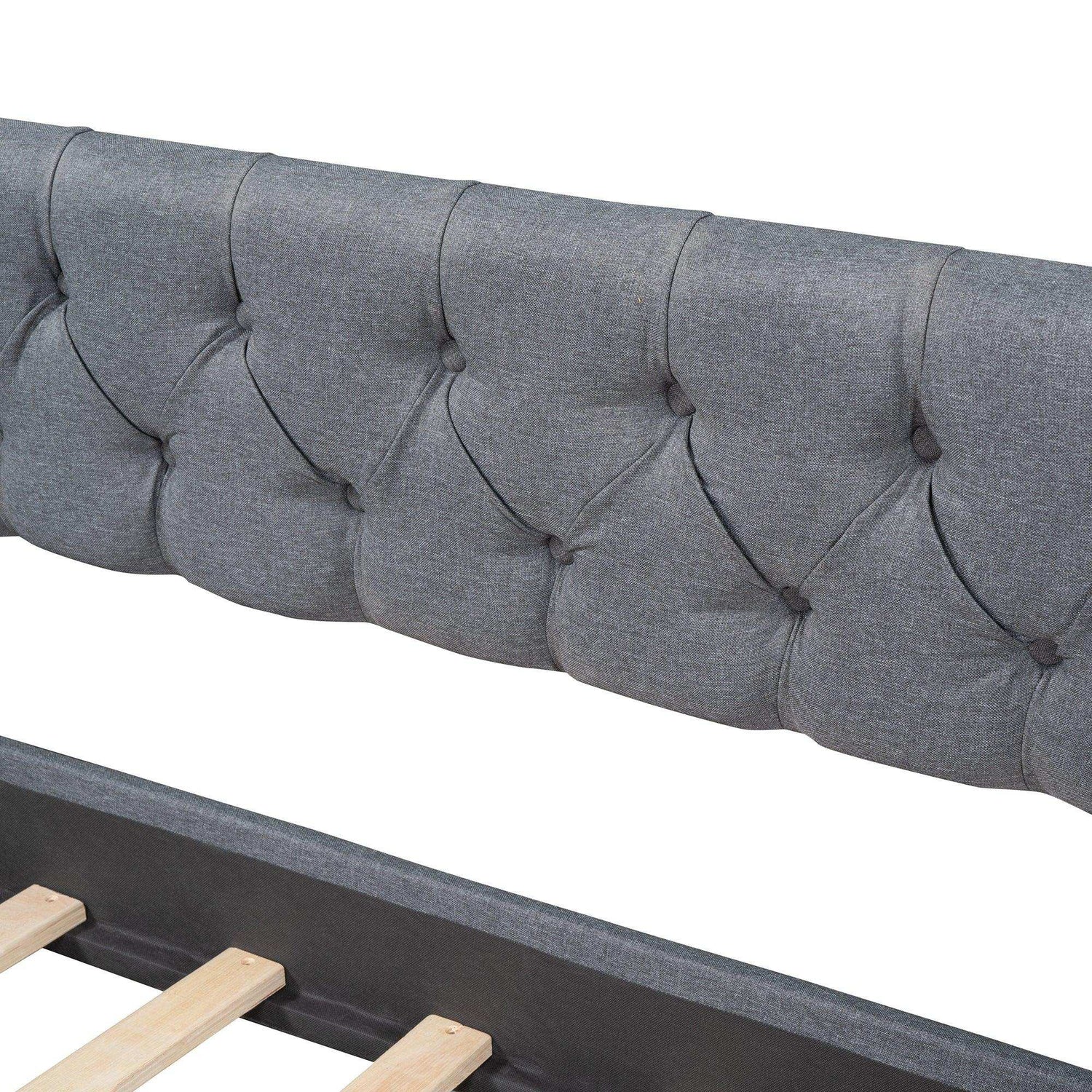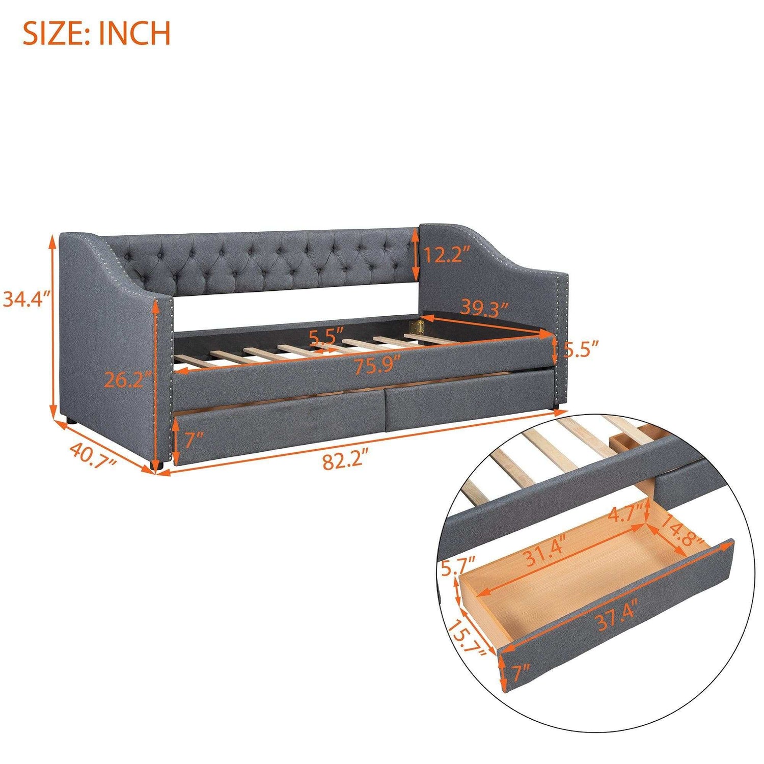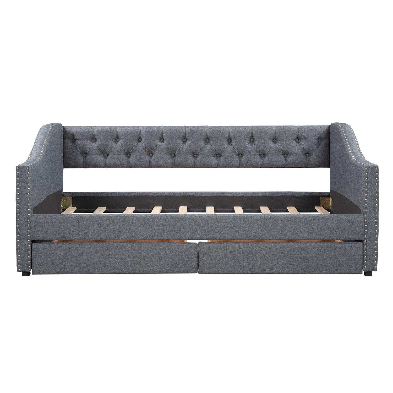 - Elegant design.Β Elegant style Upholstered in carefully-selected linen fabric, in elegant gray, feature a diamond-tufted backrest and two armrests with rivets, this daybed not only suits any home dΓ©cor, but is timeless in its design. The soft textile bedhead creates coziness, while the single color of the design creates versatility.